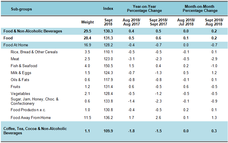 Table 1: Consumer Price Index (2010=100): Annual Percentage Change by Sub-Groups Food & Non-Alcoholic Beverages, Malaysia, September 2018/September 2017