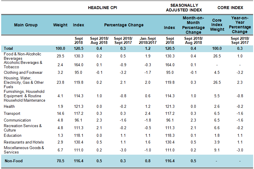 On a monthly basis, CPI increased 0.4 per cent as compared to August 2018. CPI for the period January-September 2018 registered an increase of 1.2 per cent as compared to the same period last year.