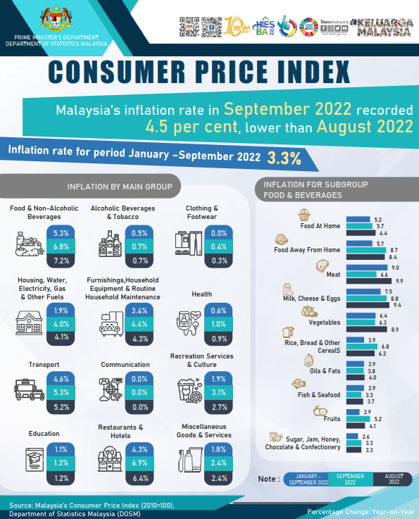 Malaysia’s inflation rate in September 2022 recorded 4.5 per cent, lower than 4.7 per cent in August 2022. Food inflation increased at a slower rate of 6.8 per cent as compared to August 2022 (7.2%).
