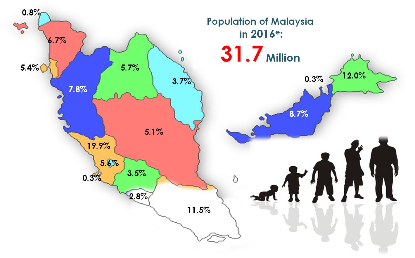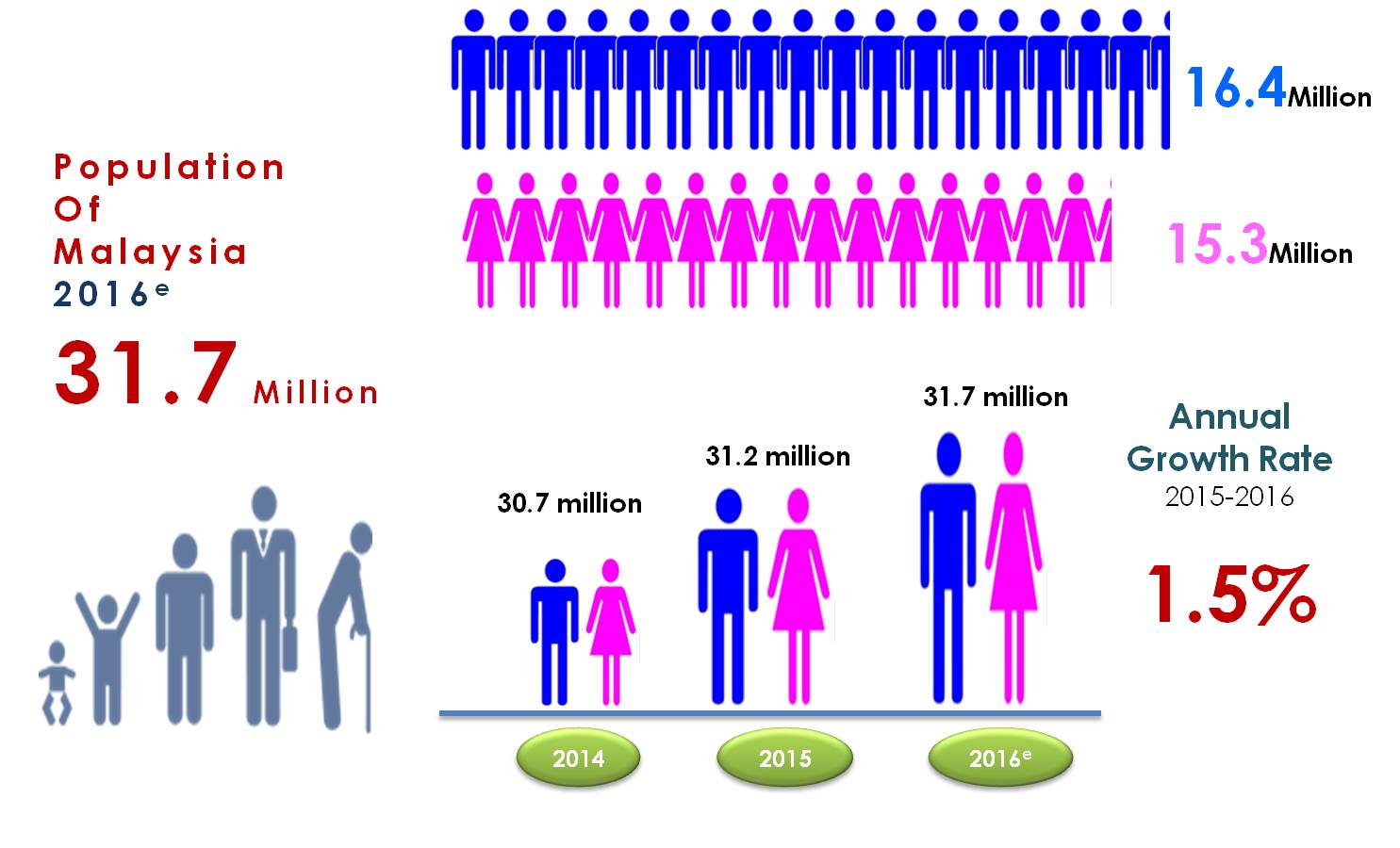 In 2016, total population of Malaysia is estimated at 31.7 million persons, an increase of 0.5 million persons as compared to 31.2 million persons in 2015 with 1.5 per cent population growth rate for the same period.