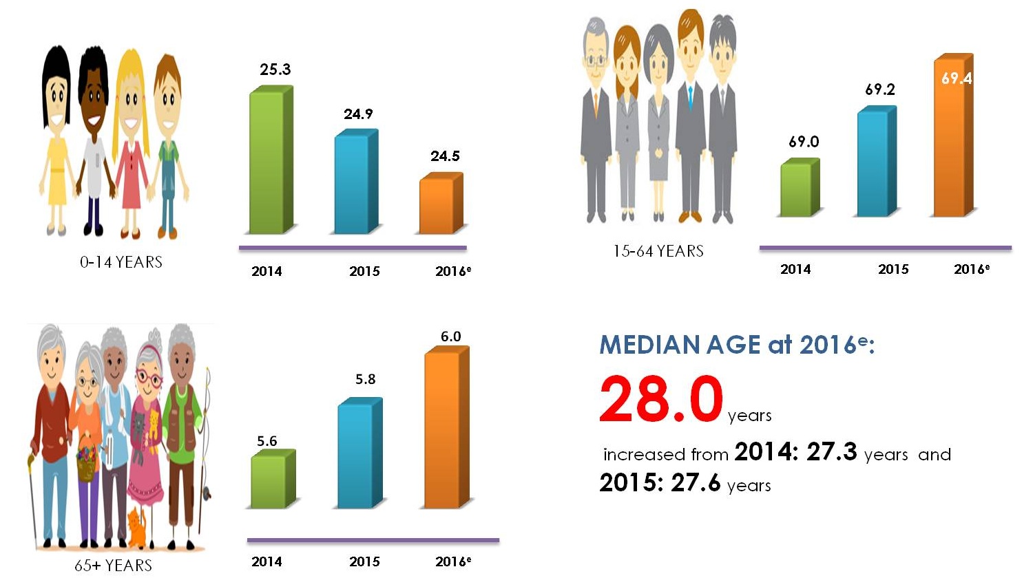 Working age population, 15-64 years old, increased by 0.2 percentage point at 2016 as compared to 2015. Subsequently, population aged 65 years and above was also increased by 0.2 percentage points at the same period.