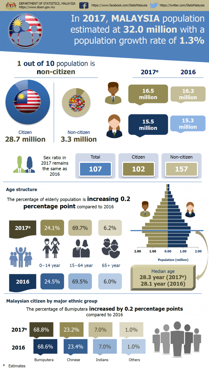 In 2017, the population in Malaysia is estimated at 32.0 million with 28.7 million are citizens and 3.3 million are non-citizens.