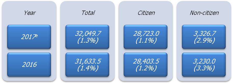 Compared to 2016, the population growth rate of citizens and non-citizens in 2017 decreased by 1.1 per cent and 2.9 per cent respectively. The population growth rate for overall was 1.3 per cent.