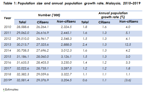 Malaysia’s population in 2019 is estimated at 32.6 million, increased from 32.4 million as compared to 2018. The total population comprises of 29.4 million (90.2%) Citizens and 3.2 million (9.8%) Non–citizens.