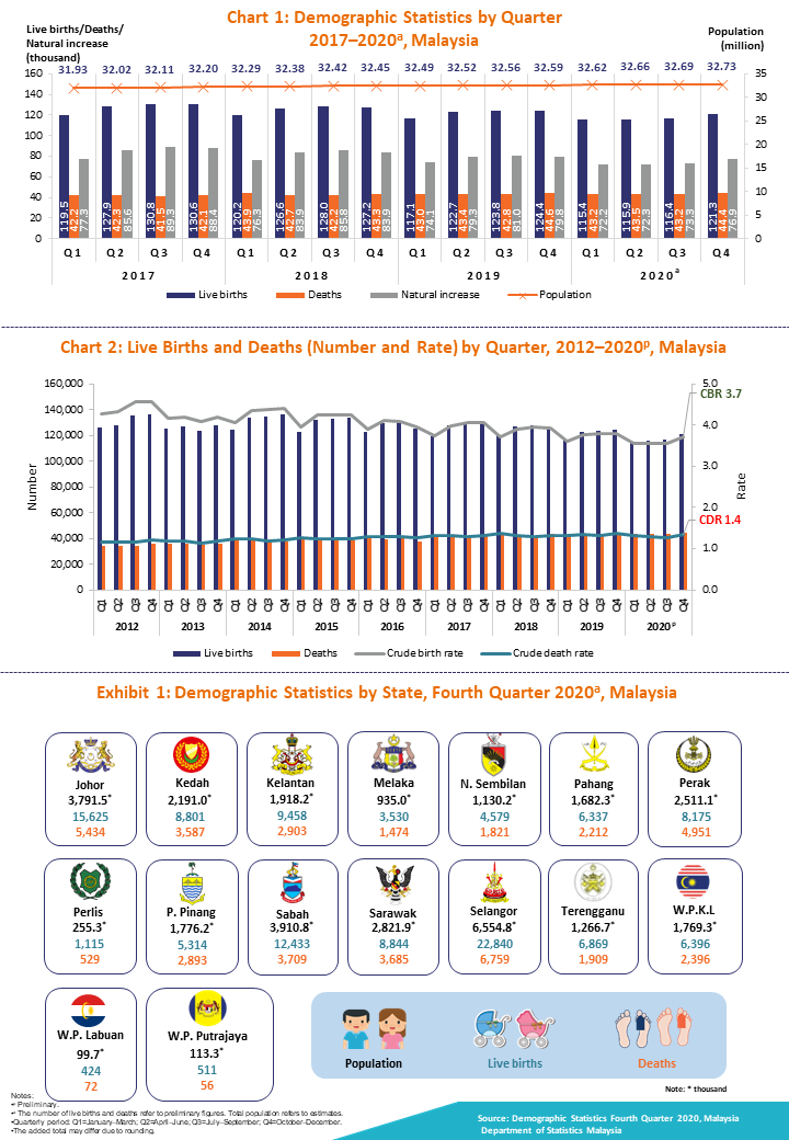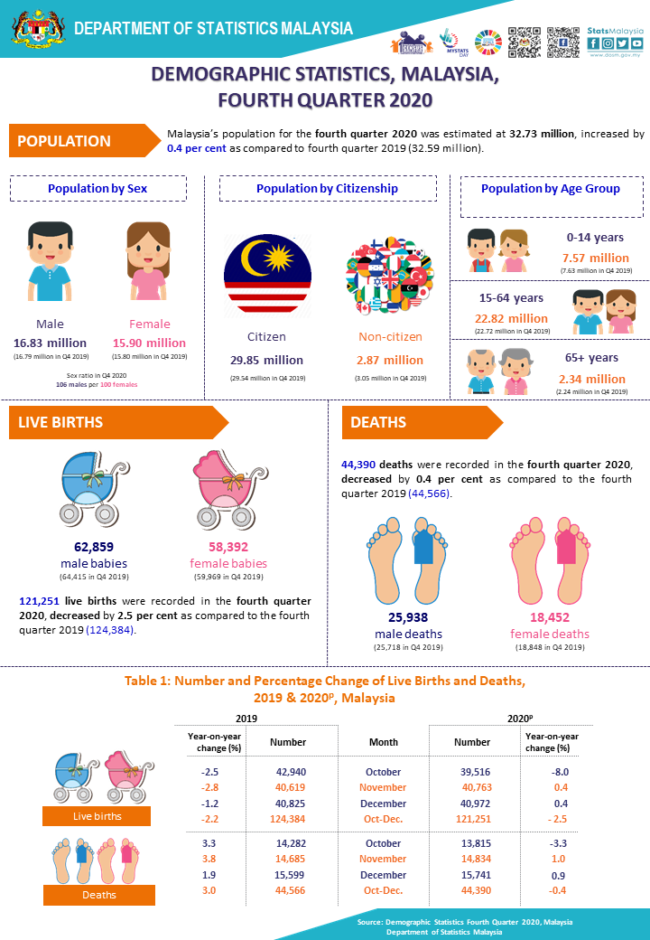 The full publication of the Demographic Statistics, Malaysia Fourth Quarter 2020, can be downloaded through eStatistik Portal.