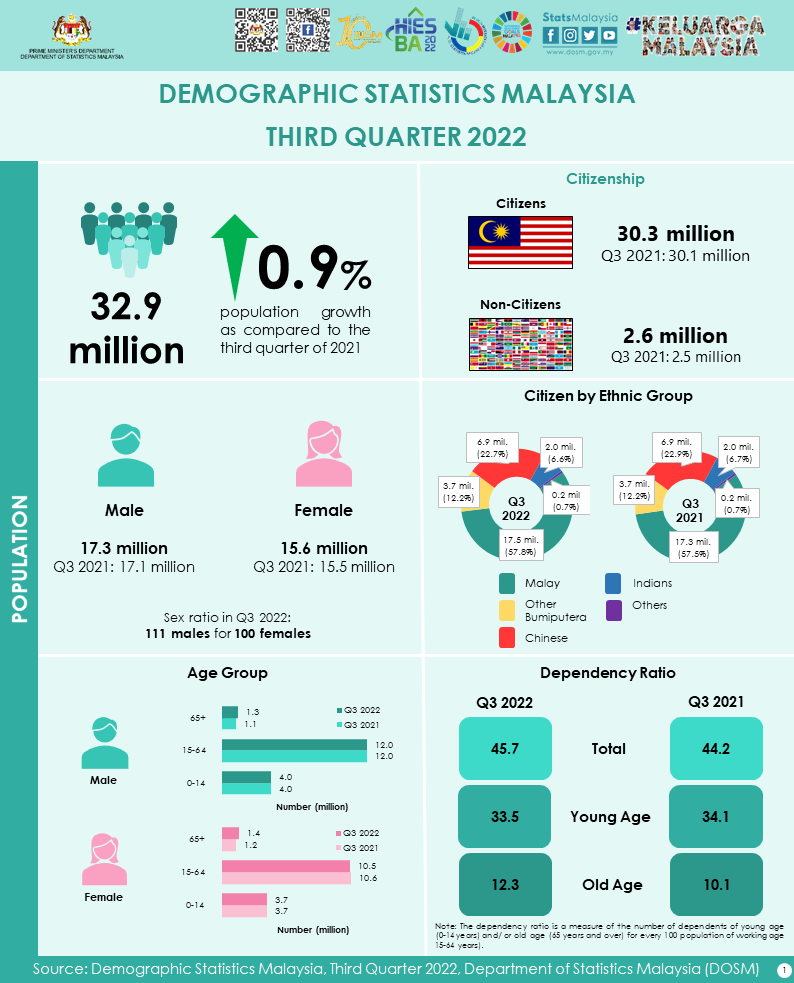 - Malaysia’s population in the third quarter 2022 was estimated at 32.9 million, increased by 0.9 per cent as compared to third quarter 2021 (32.6 million). The total population comprised 30.3 million (92.2%) Citizens and 2.6 million (7.8%) Non-Citizens.