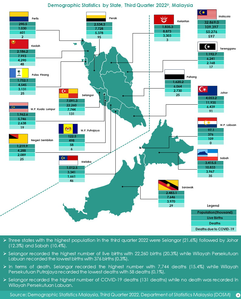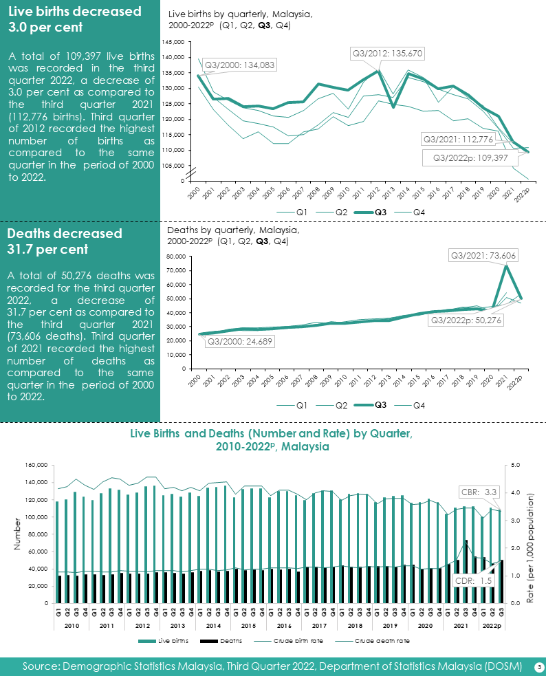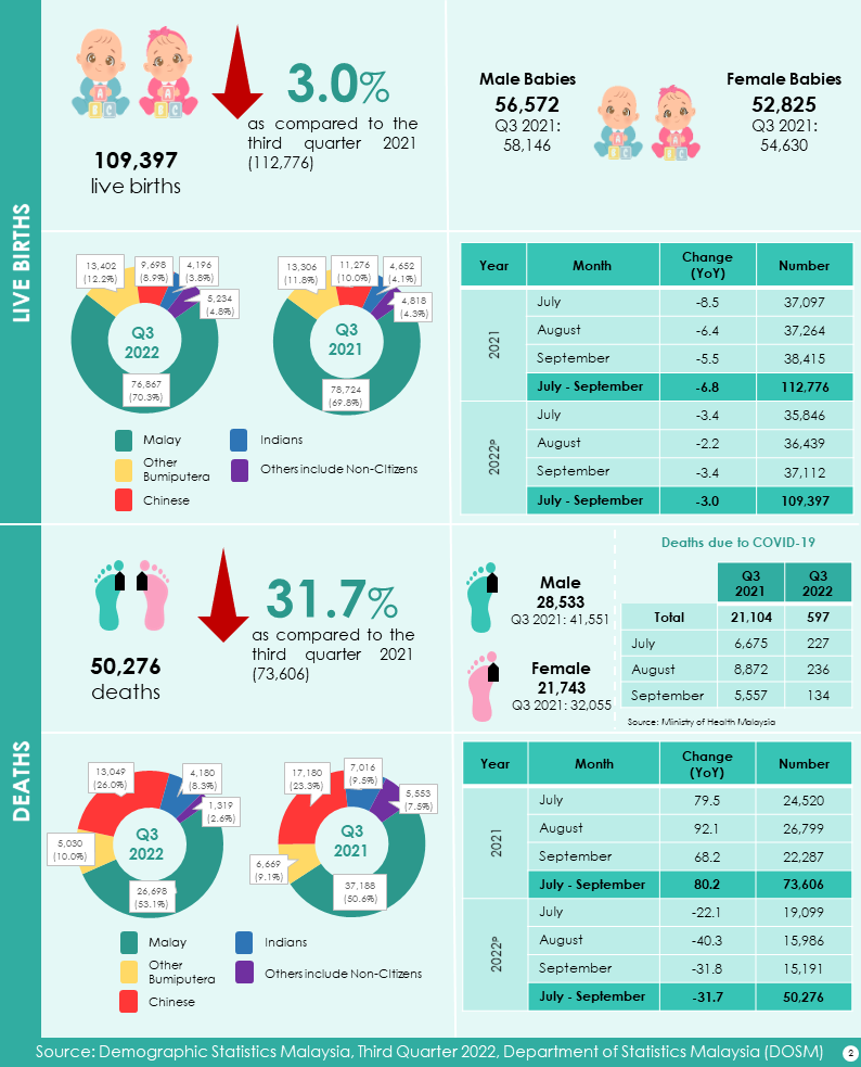 - The number of live births for the third quarter of 2022 decreased 3.0 per cent from 112,776 births in the third quarter of 2021 to 109,397 births. Males babies outnumbered females babies with 56,572 births as compared to females babies (52,825 births). Selangor recorded the highest live births with 22,260 births (20.3%) while Wilayah Persekutuan Labuan recorded the lowest (376 births: 0.3%).