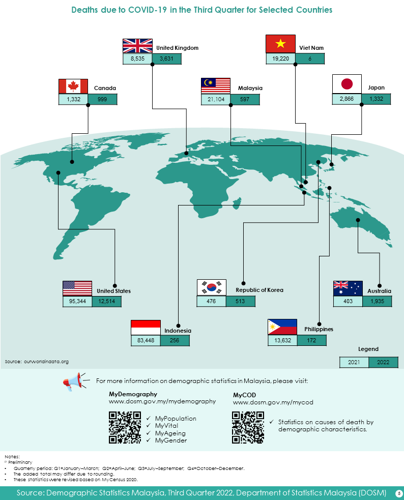 - Deaths due to COVID-19 decreased in the third quarter of 2022 from 21,104 deaths in the third quarter of 2021 to 597 deaths. Deaths due to COVID-19 contributed 1.2 per cent from the total number of deaths in the third quarter of 2022. Selangor recorded the highest number of COVID-19 deaths (131 deaths) while no death was recorded in Wilayah Persekutuan Labuan.