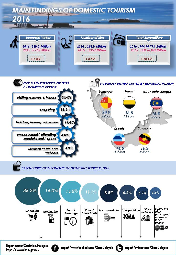 This report presents statistics on domestic tourism which covered Malaysian residents aged 15 years and above in urban and rural areas. The statistics presented are based on Domestic Tourism Survey conducted in 2016.