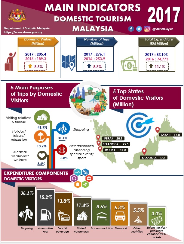 In 2017, domestic tourism Malaysia achieved a higher record in number of visitor arrivals and tourism expenditure.