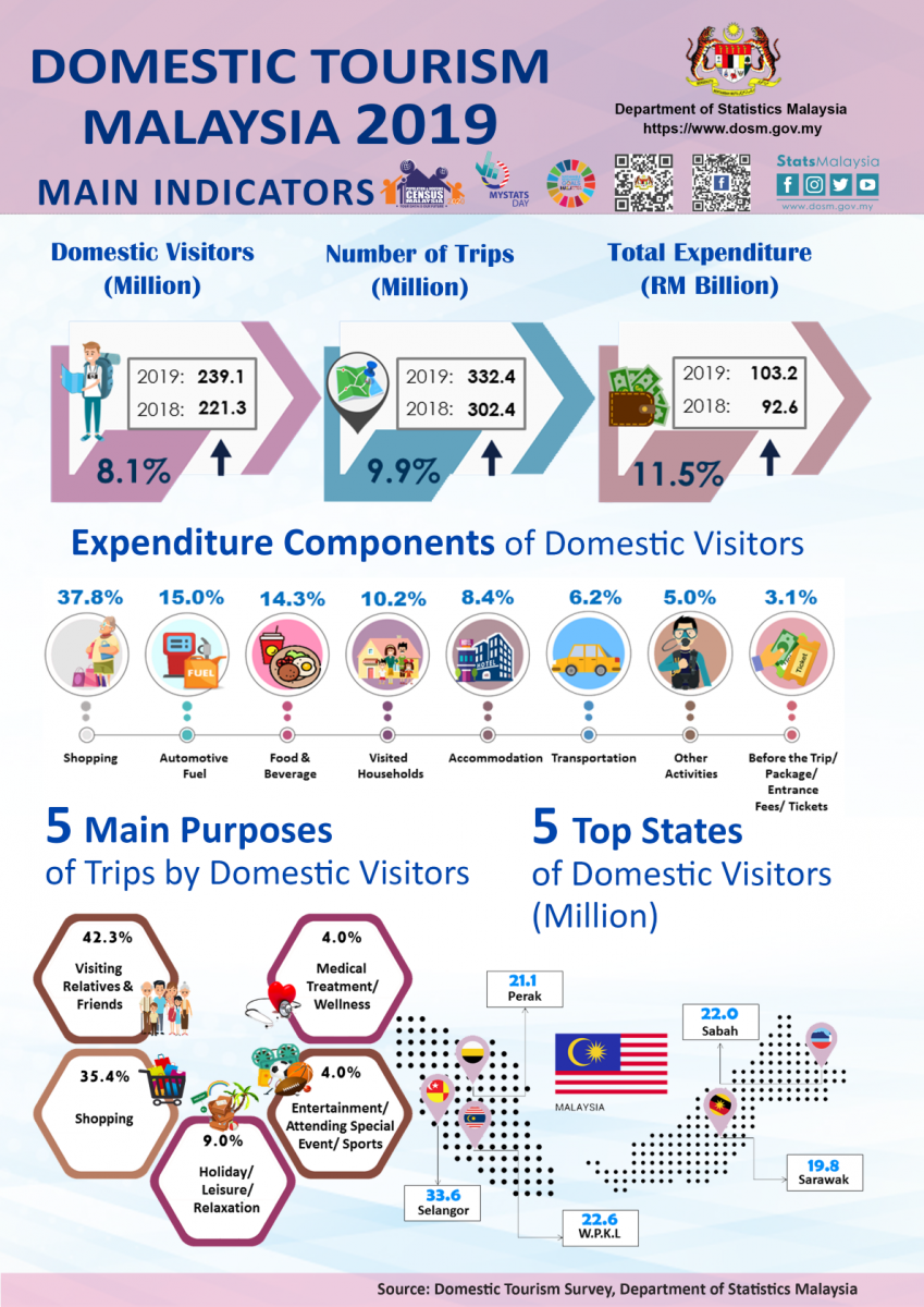 - Domestic tourism expenditure continued to register a double-digit growth with 11.5 per cent to RM103.2 billion in 2019 (2018: 11.4%).
