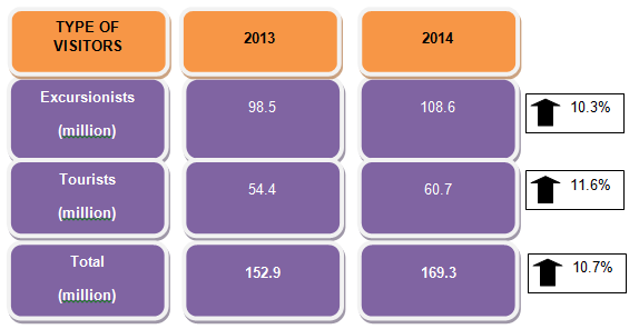A total of 169.3 million domestic visitors were registered in 2014 of which 108.6 million excursionists, while the remaining 60.7 million were tourists. The number of excursionists and domestic tourists increased by 10.3 per cent and 11.6 per cent respectively as compared to the previous year (Table B).