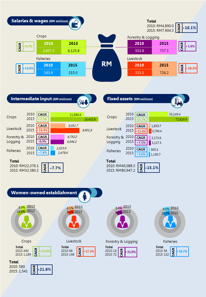 In 2015, number of establishments operating in the agriculture sector was 11,628 establishments with an annual growth of 5.7 per cent. Gross output in 2015 was RM73,853.6 million, an increase of 6.7 per cent per year compared to RM53,452.1 million in 2010 while value added for this sector was RM41,473.4 million.