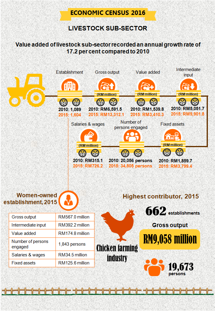 In 2015, number of establishments involved in the livestock sub-sector was 1,604 establishments. Gross output value was RM13,312.1 million or 18.0 per cent from total gross output of the agriculture sector with value added of RM3,410.3 million. This sub-sector also provides job opportunities to 34,805 people with salaries & wages paid amounting RM726.2 million.