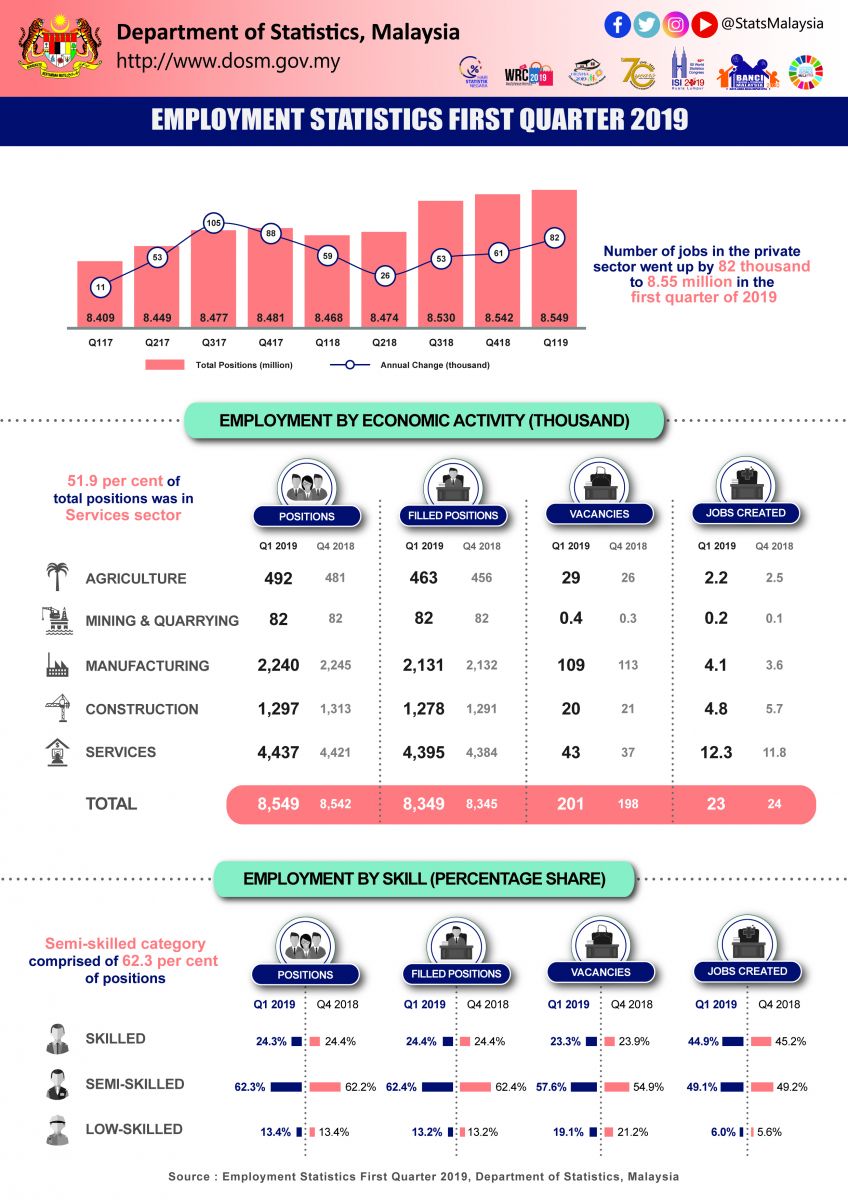 The detailed information and technical notes are published in the publication of Employment Statistics, First Quarter 2019. This publication is accessible and downloadable free of charge through the eStatistik application in DOSM web page, www.dosm.gov.my.