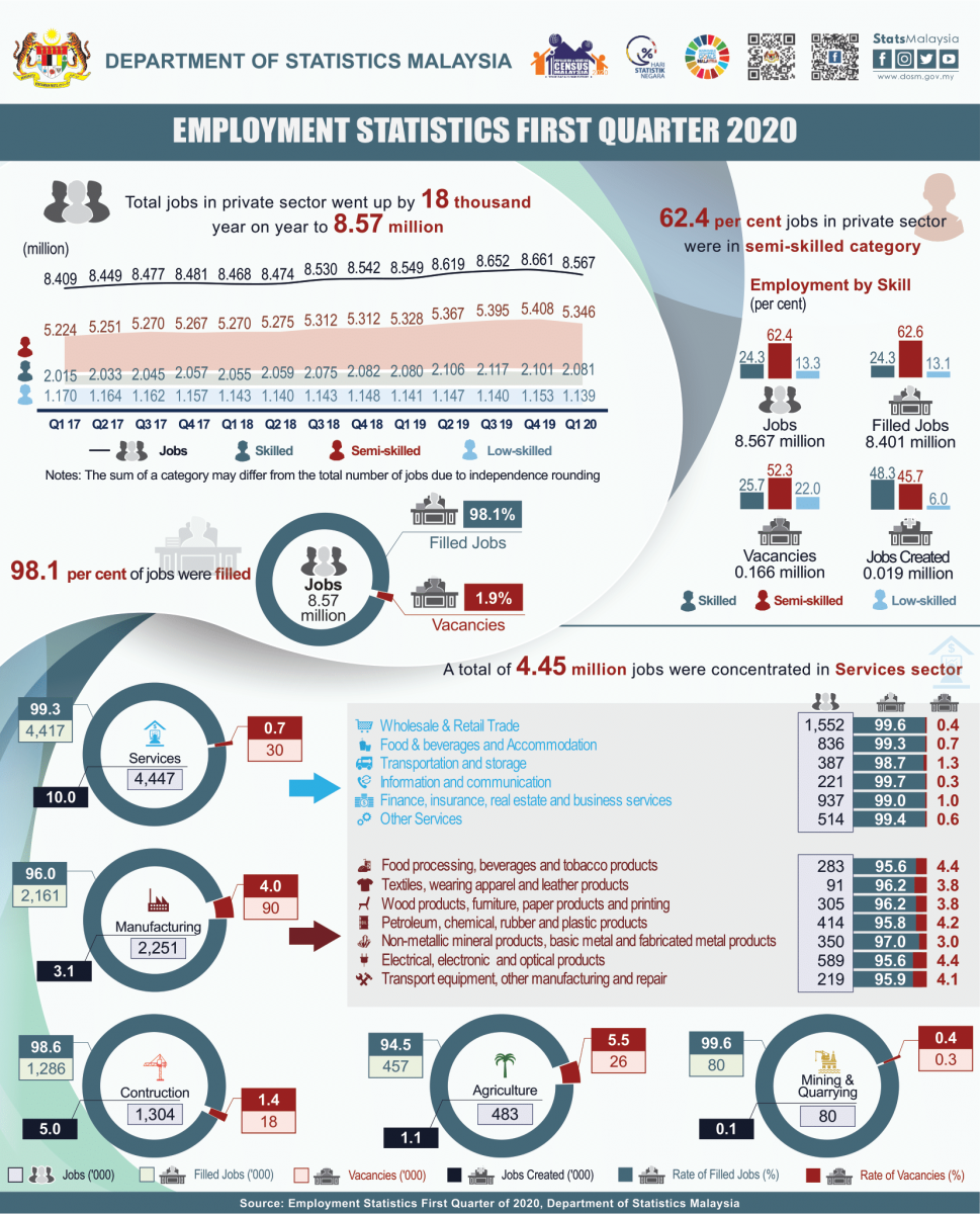The detailed information and technical notes are published in the publication of Employment Statistics, First Quarter 2020. This publication is accessible and downloadable free of charge through the eStatistik application in DOSM web page, www.dosm.gov.my.