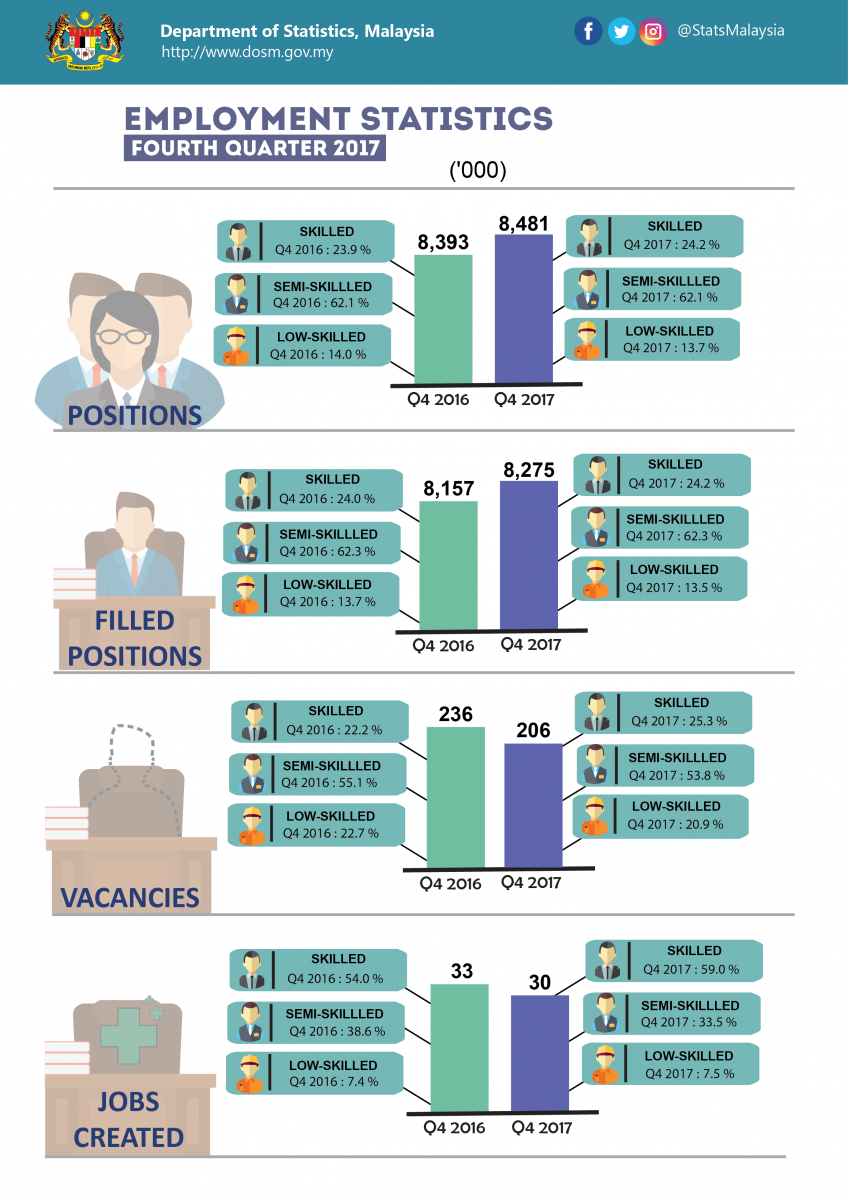 The detailed information and technical notes are published in the Employment Statistics, Fourth Quarter 2017. This publication is accessible and downloadable free of charge through the eStatistik application in DOSM web page, www.dosm.gov.my.