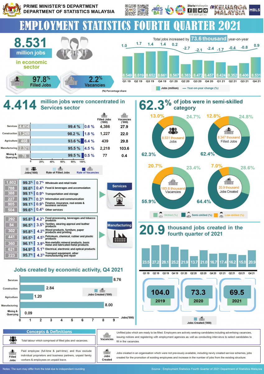 The detailed information and technical notes are published in the publication of Employment Statistics, Fourth Quarter 2021. This publication is accessible and downloadable free of charge through the eStatistik application in DOSM web page, www.dosm.gov.my.