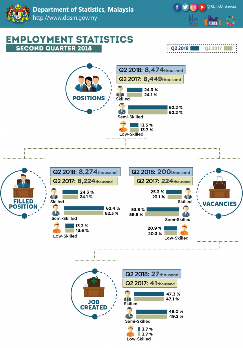 The detailed information and technical notes are published in the Employment Statistics, Second Quarter 2018. This publication is accessible and downloadable free of charge through the eStatistik application in DOSM web page, www.dosm.gov.my.