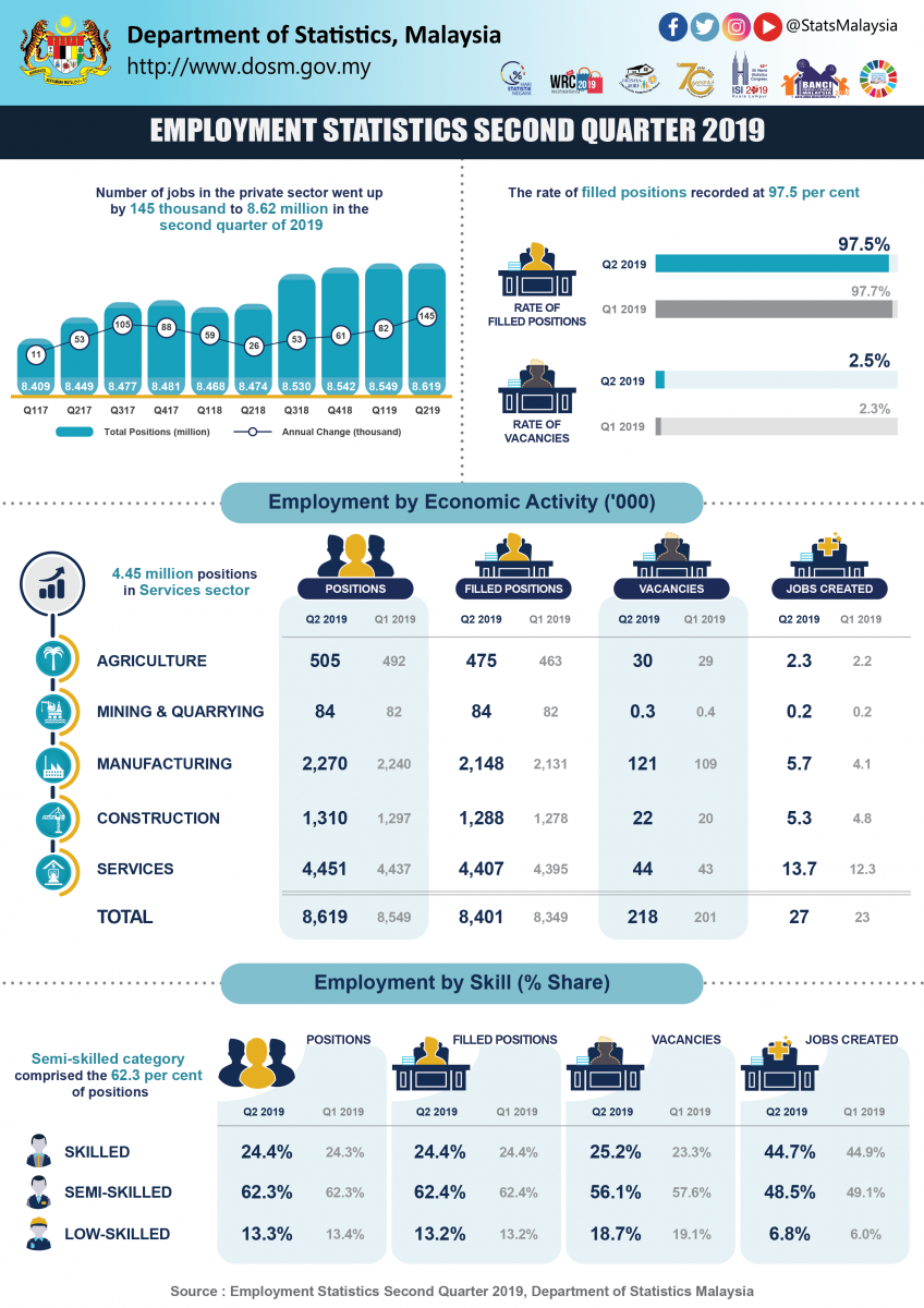 The detailed information and technical notes are published in the publication of Employment Statistics, Second Quarter 2019. This publication is accessible and downloadable free of charge through the eStatistik application in DOSM web page, www.dosm.gov.my.