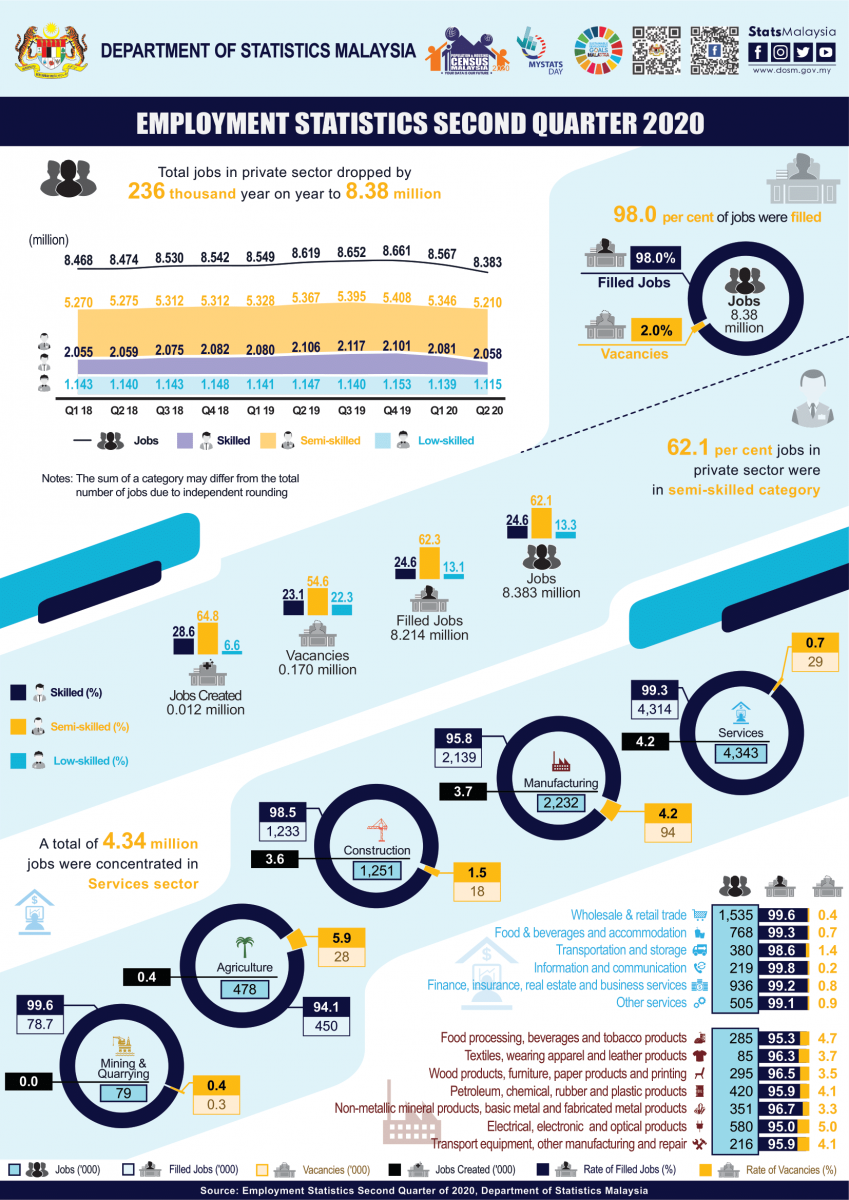 The detailed information and technical notes are published in the publication of Employment Statistics, Second Quarter 2020. This publication is accessible and downloadable free of charge through the eStatistik application in DOSM web page, www.dosm.gov.my.