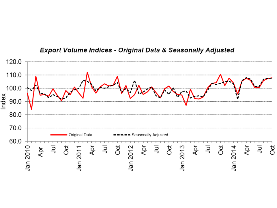 In seasonally adjusted terms, the export volume index increased 0.1% to 107.5 points.