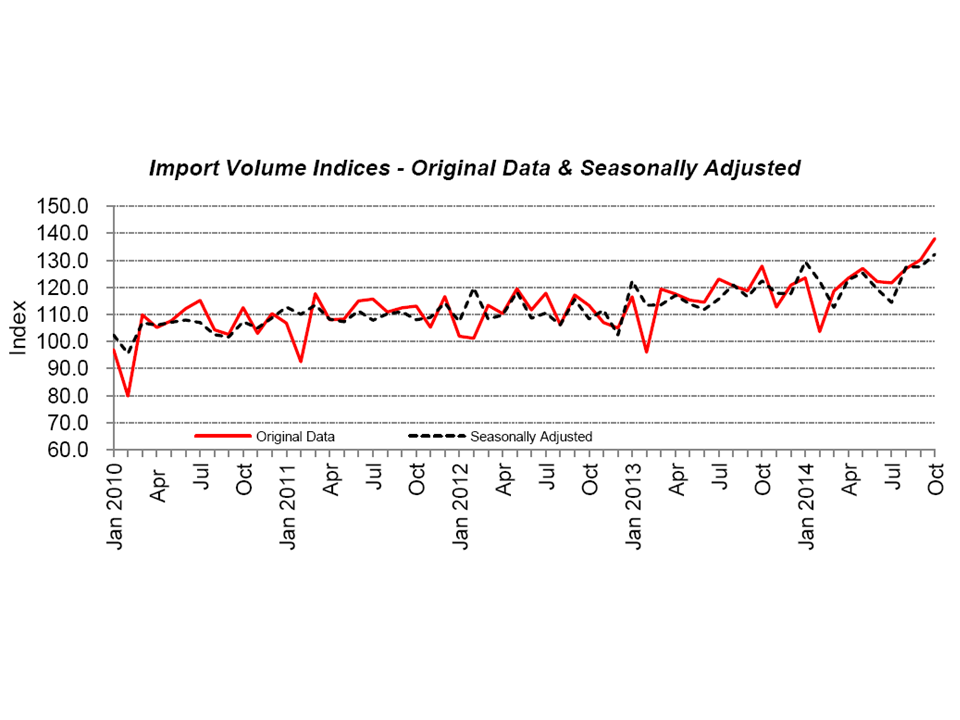 In seasonally adjusted terms, the import volume index in October 2014 increased 3.7% to 132.3 points.