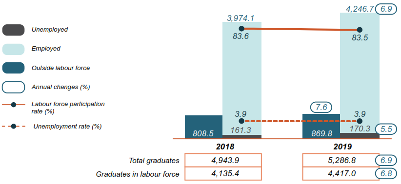 The number of unemployed graduates in 2019 was 170.3 thousand persons, increased 5.5 per cent (2018: 161.3 thousand persons). Active unemployed graduates accounted for 74.8 per cent (127.4 thousand persons) to the total unemployed graduates. More than half of active unemployed graduates were unemployed less than three months which was 51.6 per cent (65.7 thousand persons) while 29.5 per cent (37.5 thousand persons) of them were unemployed within three months and less than six months. On the other hand, 10.9 per cent (13.9 thousand persons) of them were unemployed within six months and less than a year whereas another 8.1 per cent (10.3 thousand persons) were unemployed more than a year.