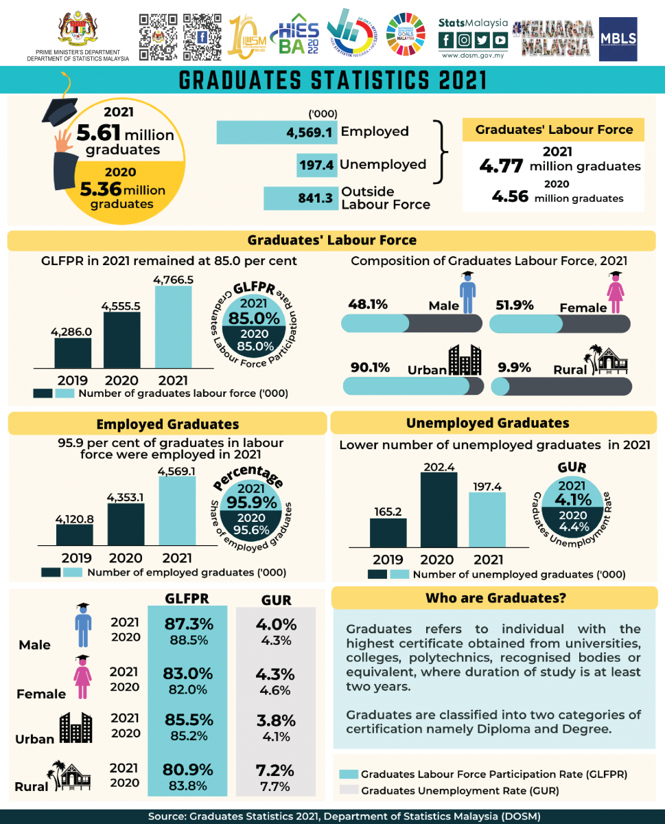 Graduates Statistics 2021 presents the statistics of graduates within and outside the labour force as well as the salaries & wages of graduates in Malaysia. Various data sources were utilised in compiling the statistics namely the Labour Force Survey, Higher Education Statistics, Graduate Tracers Study and Salaries & Wages Survey. Graduates are defined as individuals aged 15 years and above with highest certificate obtained from universities, colleges, polytechnics, recognised bodies or equivalent, in which the duration of study is at least two years. Graduates are classified into two categories of certification namely Diploma and Degree.