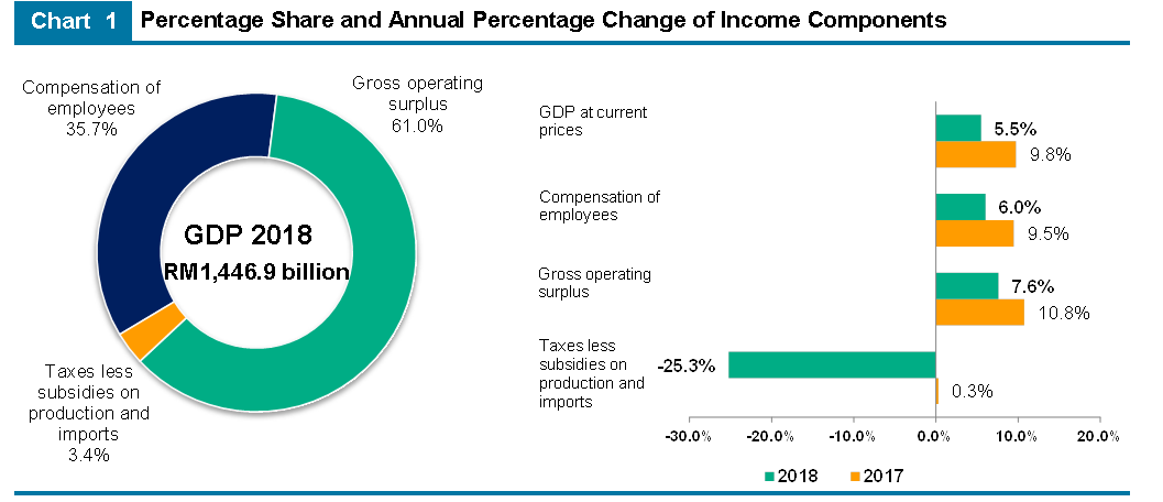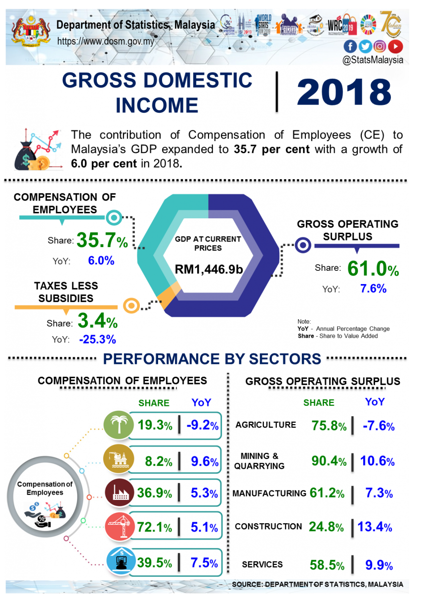 Malaysia’s Gross Domestic Product (GDP) at current prices recorded a value of RM1,446.9 billion (2017: RM1,371.6 billion) and grew 5.5 per cent in 2018. The GDP was contributed by Gross Operating Surplus (GOS) which amounted to RM882.5 billion (2017: RM820.2 billion) while Compensation of Employees (CE) has reached RM515.9 billion, an increase of RM29.3 billion from 2017. Taxes less Subsidies on Production and Imports stood at RM48.5 billion as compared to RM64.9 billion in the previous year.