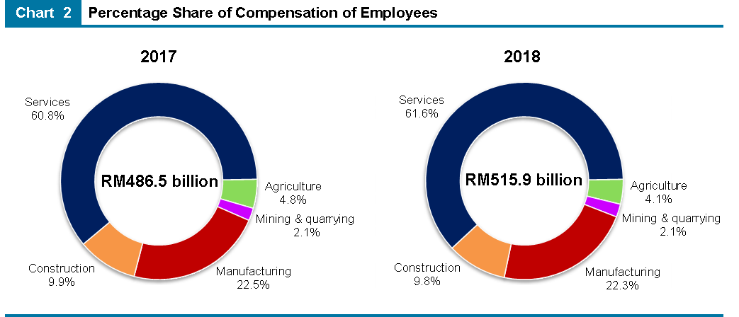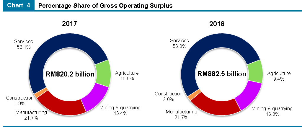 GOS contributed 61.0 per cent to the Malaysia’s GDP in 2018. As the largest contributor to the economy, Services sector accounted for 53.3 per cent to the total GOS in 2018 followed by Manufacturing sector at 21.7 per cent as shown in Chart 4. Mining & quarrying and Agriculture sectors recorded 13.8 per cent and 9.4 per cent respectively. Meanwhile, Construction sector recorded a contribution of 2.0 per cent to the total of GOS.