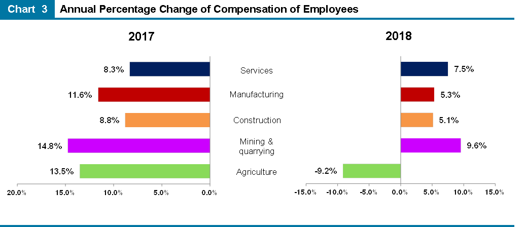 In 2018, CE posted a growth of 6.0 per cent as compared to 9.5 per cent in the preceding year. The momentum was largely driven by Services sector which continued to record a favourable growth by registering 7.5 per cent in this year (Chart 3).