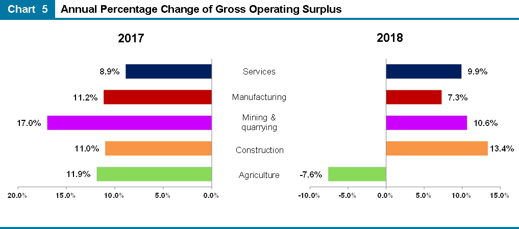 The momentum of GOS in Mining & quarrying sector expanded 10.6 per cent from 17.0 per cent in 2017 spearheaded by crude oil, condensate & natural gas. In addition, the growth of GOS in Construction sector has increased further to 13.4 per cent from 11.0 per cent in 2017.