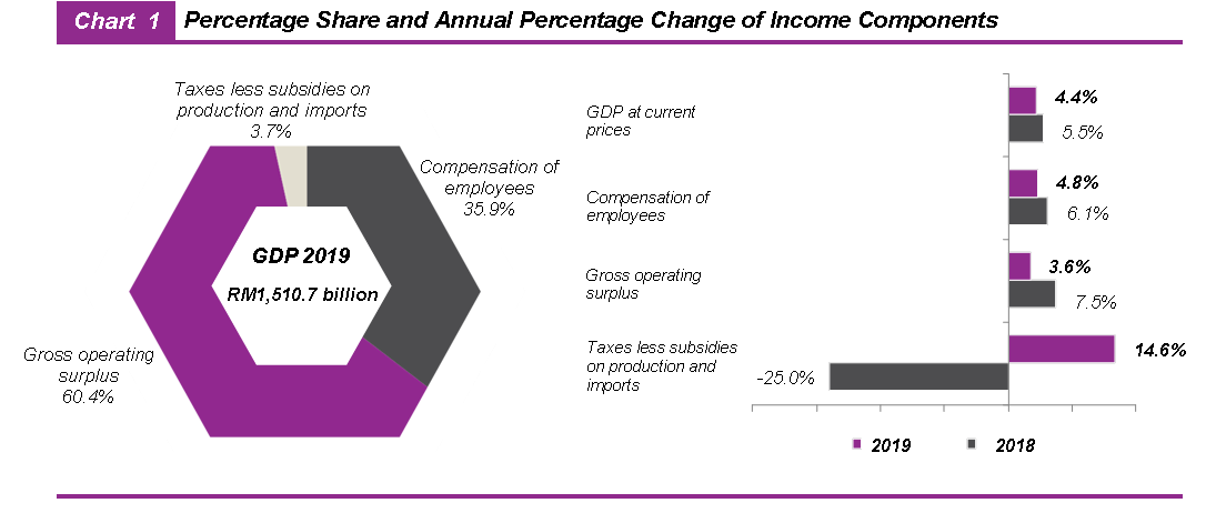 GOS maintained its position as the largest income component to GDP with a share of 60.4 per cent (2018: 60.9%) and registered a growth of 3.6 per cent compared to 7.5 per cent in the preceding year. The contribution of CE to Malaysia’s economy was 35.9 per cent and recorded a growth of 4.8 per cent (2018: 6.1%) which was largely led by Services and Manufacturing sectors. Taxes less Subsidies on Production and Imports formed 3.7 per cent (2018: 3.4%) of overall income and registered a double-digit growth of 14.6 per cent (2018: -25.0%) as depicted in Chart 1.