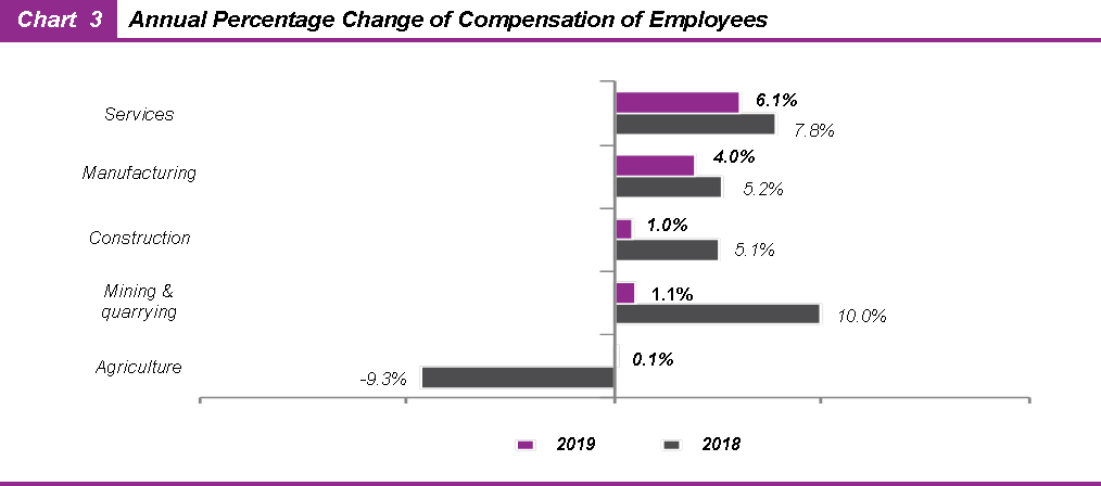 Construction sector moderated to 1.0 per cent from 5.1 per cent in the preceding year. The growth was attributed by civil engineering and specialised construction activities. Furthermore, Mining & quarrying sector posted a slower growth of 1.1 per cent against 10.0 per cent in 2018. CE for Agriculture sector rebounded to 0.1 per cent from negative 9.3 per cent in the previous year. The recovery in this sector was mainly supported by the better performance in Rubber, oil palm, livestock and other agriculture activities (Chart 3).