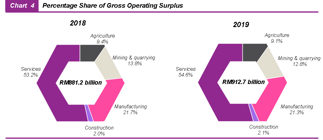 The momentum of GOS in Construction sector remained its double-digit growth of 10.2 per cent against 13.0 per cent in the preceding year which was mainly supported by the performance of civil engineering activities. However, Mining & quarrying sector declined 4.0 per cent from 11.1 per cent in 2018. Meanwhile, Agriculture sector rebounded to 1.2 per cent from a negative 7.3 per cent in the preceding year. The growth was supported by Rubber, oil palm, livestock and other agriculture which improved to 2.3 per cent (2018: -10.4%).