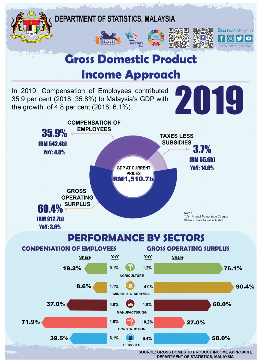 Malaysia’s economy registered a value of RM1,510.7 billion (2018: RM1,447.5 billion) at current prices, grew 4.4 per cent as compared to 5.5 per cent in 2018 amid challenging economy in 2019. The value of GDP consists of GOS which recorded a value of RM912.7 billion (2018: RM881.2 billion), while CE reached RM542.4 billion (2018: RM517.8 billion) and Taxes less Subsidies on Production and Imports stood at RM55.6 billion (2018: RM48.5 billion).