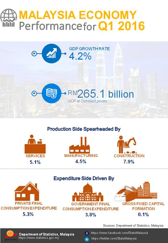 Manufacturing sector grew 4.5 per cent (Q4 2015: 5.0%) which was underpinned by Electrical, Electronic & Optical products (5.7%), mainly in semiconductors, computers and peripheral equipments. This sector performance was further supported by Petroleum, Chemical, Rubber & Plastic products that grew 2.7 per cent (Q4 2015: 1.4%) following a turnaround in Refined Petroleum products and expansion in Chemical and Plastic products.