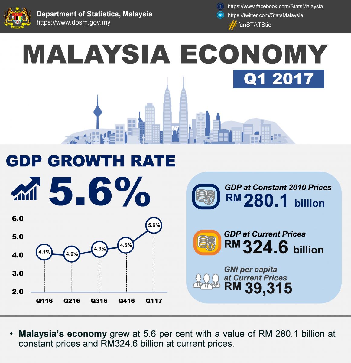 In the first quarter of 2017, Malaysia’s economy remained resilient at 5.6 per cent (Q4 2016: 4.5%). On a quarter-on-quarter seasonally adjusted, the GDP for this quarter grew at 1.8 per cent.