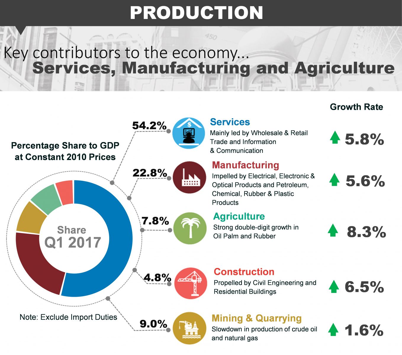Services sector recorded a steady growth of 5.8 per cent in this quarter (Q4 2016: 5.5%) mainly led by Wholesale & Retail Trade which expanded to 6.3 per cent and Information & Communication remained sound by posting a growth of 8.2 per cent. Furthermore, Business Services grew at 8.4 per cent due to a favourable momentum in Professional activities.