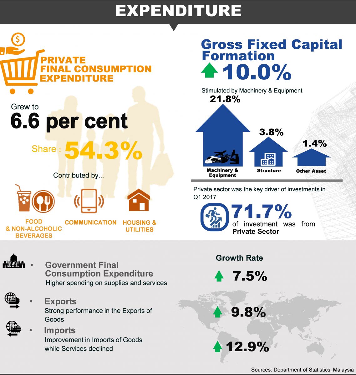 Private Final Consumption Expenditure grew 6.6 per cent (Q4 2016: 6.1%) backed by the consumption on Food & Non-Alcoholic Beverages, Communication and Housing, Water, Electricity, Gas & Other Fuels.