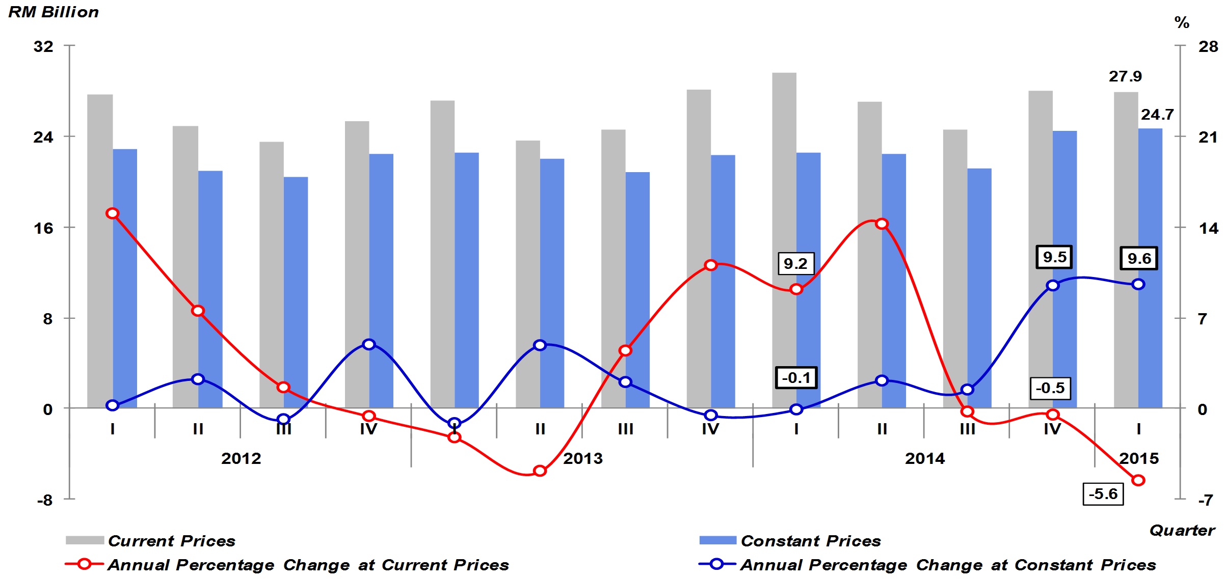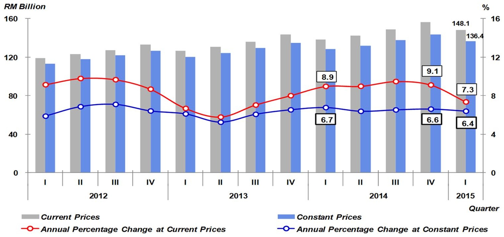 Malaysia’s economy remained resilient in first quarter of 2015 by registering a growth of 5.6 per cent. GDP in current prices amounted to RM277.2 billion in this quarter. In constant 2010 prices, GDP registered a value of RM254.4 billion.