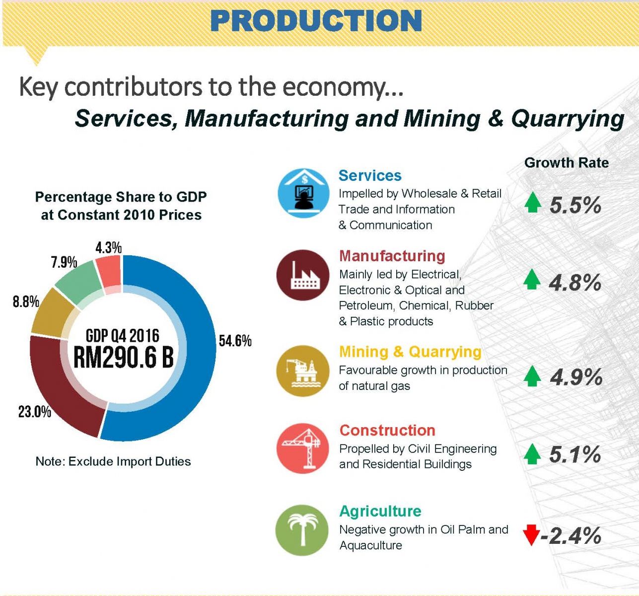 For year 2016, Malaysia’s economy grew 4.2 per cent with a value of RM1,107.9 billion at constant and RM1,229.4 billion at current prices.