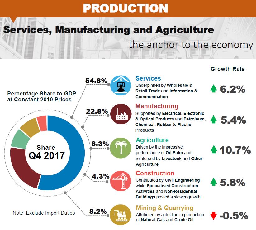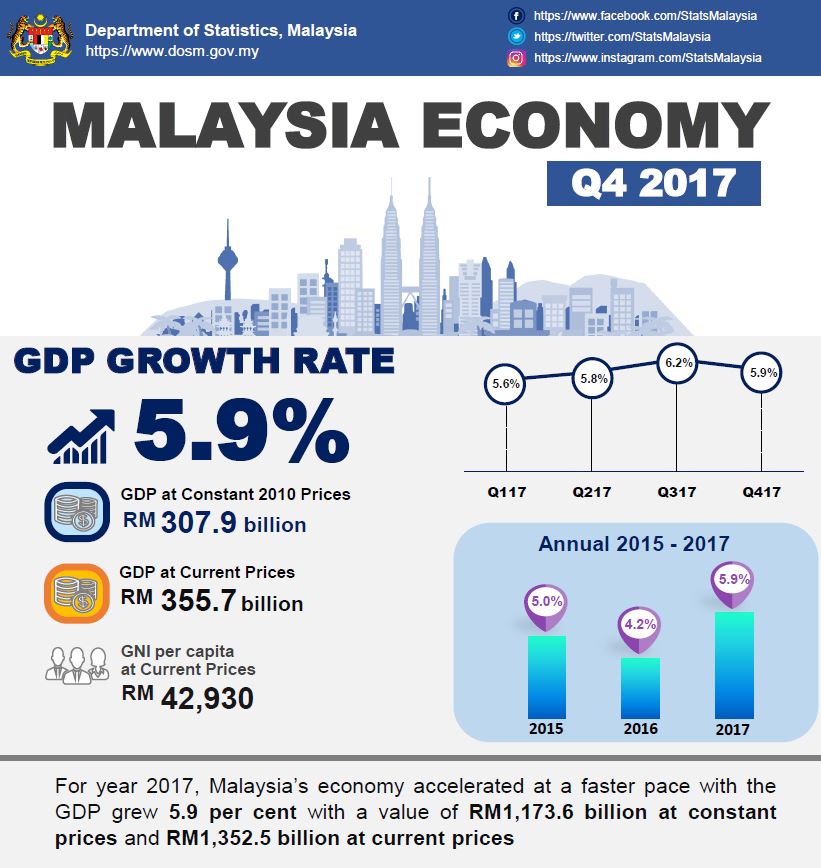 In the fourth quarter of 2017, Malaysia’s economy expanded at 5.9 per cent as compared to 6.2 per cent in the preceding quarter. On a quarter-on-quarter seasonally adjusted, GDP posted a growth of 0.9 per cent (Q3 2017: 1.8%).