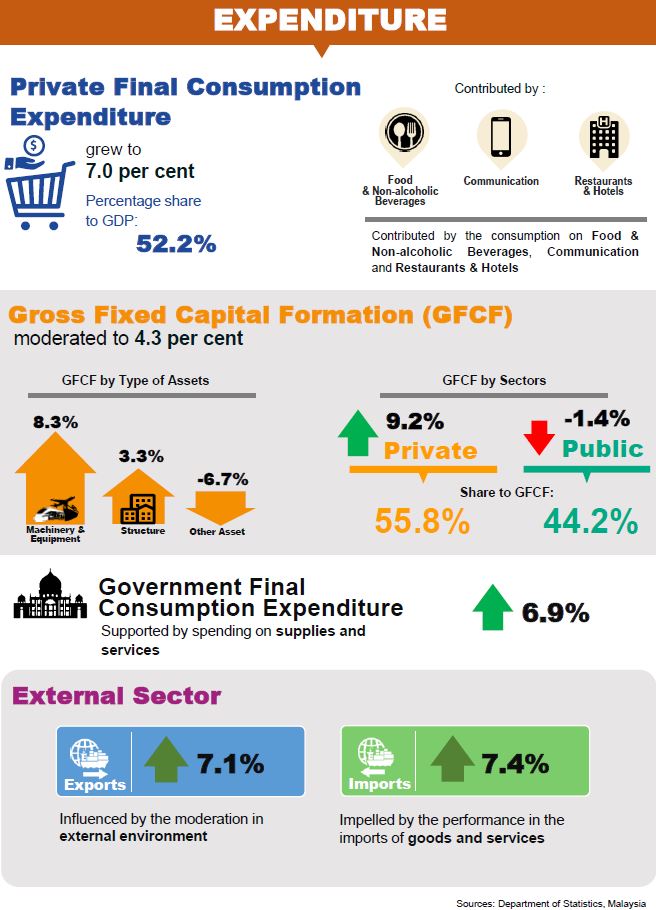 Private final consumption expenditure grew 7.0 per cent (Q3 2017: 7.2%), while on a quarter-on-quarter seasonally adjusted increased to 1.8 per cent. The momentum was contributed by the consumption on food & non-alcoholic beverages, communication, restaurants & hotels and housing & utilities.