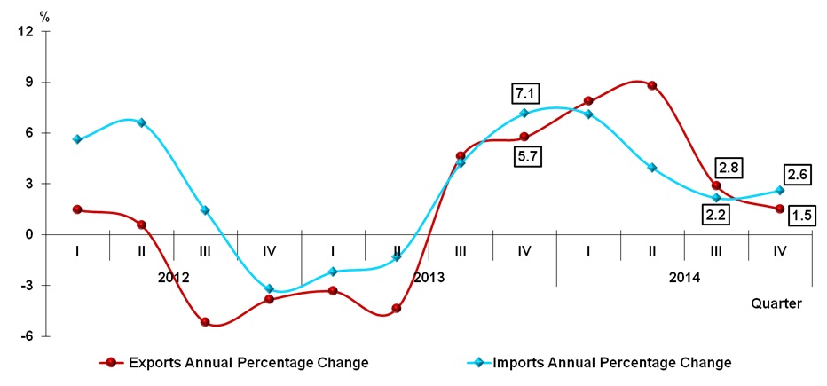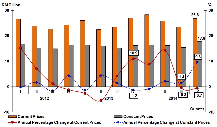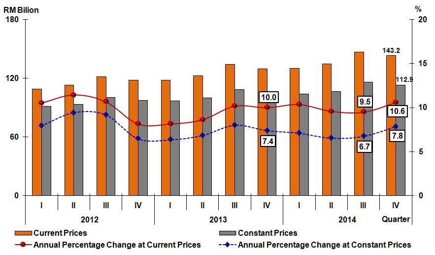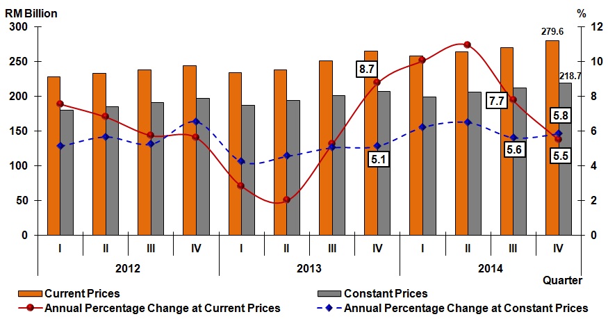 Malaysia’s economy expanded 5.8 per cent in the fourth quarter of 2014. On the supply side, the growth was stimulated by Services, Manufacturing and Mining & Quarrying sectors. For year 2014, GDP rose to 6.0 per cent with a value added of RM835 billion at constant prices and RM1,070 billion at current prices.
