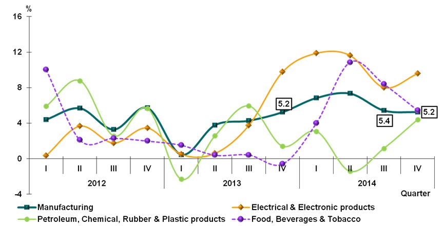 Manufacturing sector continues to spur the economy growth by registering an expansion of 5.2 per cent during the quarter. The performance was spearheaded by Electrical & Electronic products (9.6%). Petroleum, Chemical, Rubber & Plastic products improved to 4.4 per cent boosted by chemicals and refined petroleum products. Food, Beverages & Tobacco increased to 5.4 per cent following an expansion in food processing and beverages.
