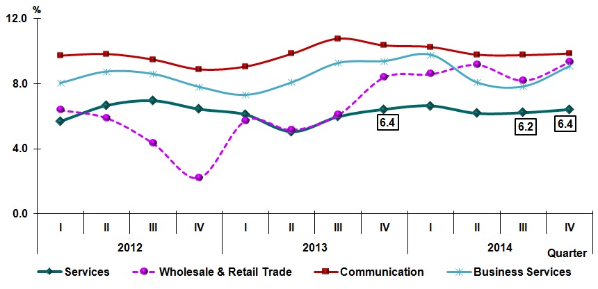 Services sector picked-up to 6.4 per cent, following a 6.2 per cent increase in the preceding quarter. The momentum in this sector was largely contributed by the growth in Wholesale & Retail Trade which augmented to 9.3 per cent. Communication remained resilient by posting a growth of 9.8 per cent and Business Services rose to 9.1 per cent.