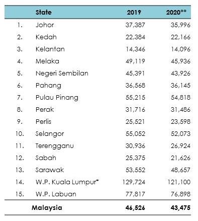 In terms of GDP Per Capita, all thirteen states and two Federal Territories recorded a decline in the value of GDP Per Capita compared to 2019. However, seven states surpassed national GDP per capita value (RM43,475) namely W.P. Kuala Lumpur (RM121,100), W.P. Labuan (RM76,898), Pulau Pinang (RM54,818), Selangor (RM52,073), Sarawak (RM48,657), Melaka (RM45,936) and Negeri Sembilan (RM43,926).