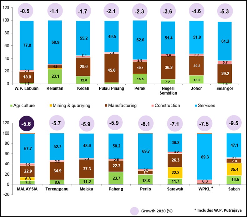 Based on the overall performance of 2020, several states contributed to the decline of main sectors. The Services sector, which contributed 57.7 per cent to the Malaysia’s economy, recorded a negative 5.5 per cent (2019: 6.2%). States with large contributions in the tourism-related industries were more affected due to travel restrictions as well as border closure policies which has led to the reduction in foreign tourist arrivals as well as interstate domestic tourists. Among the states that contributed to the decline in this sector were Selangor (-6.8%, 2019: 7.0%), W.P. Kuala Lumpur (-6.0%, 2019: 6.2%), Sabah (-7.4%, 2019: 5.4%), Pahang (-8.7%, 2019: 6.2%) and Johor (-3.4%, 2019: 6.5%).